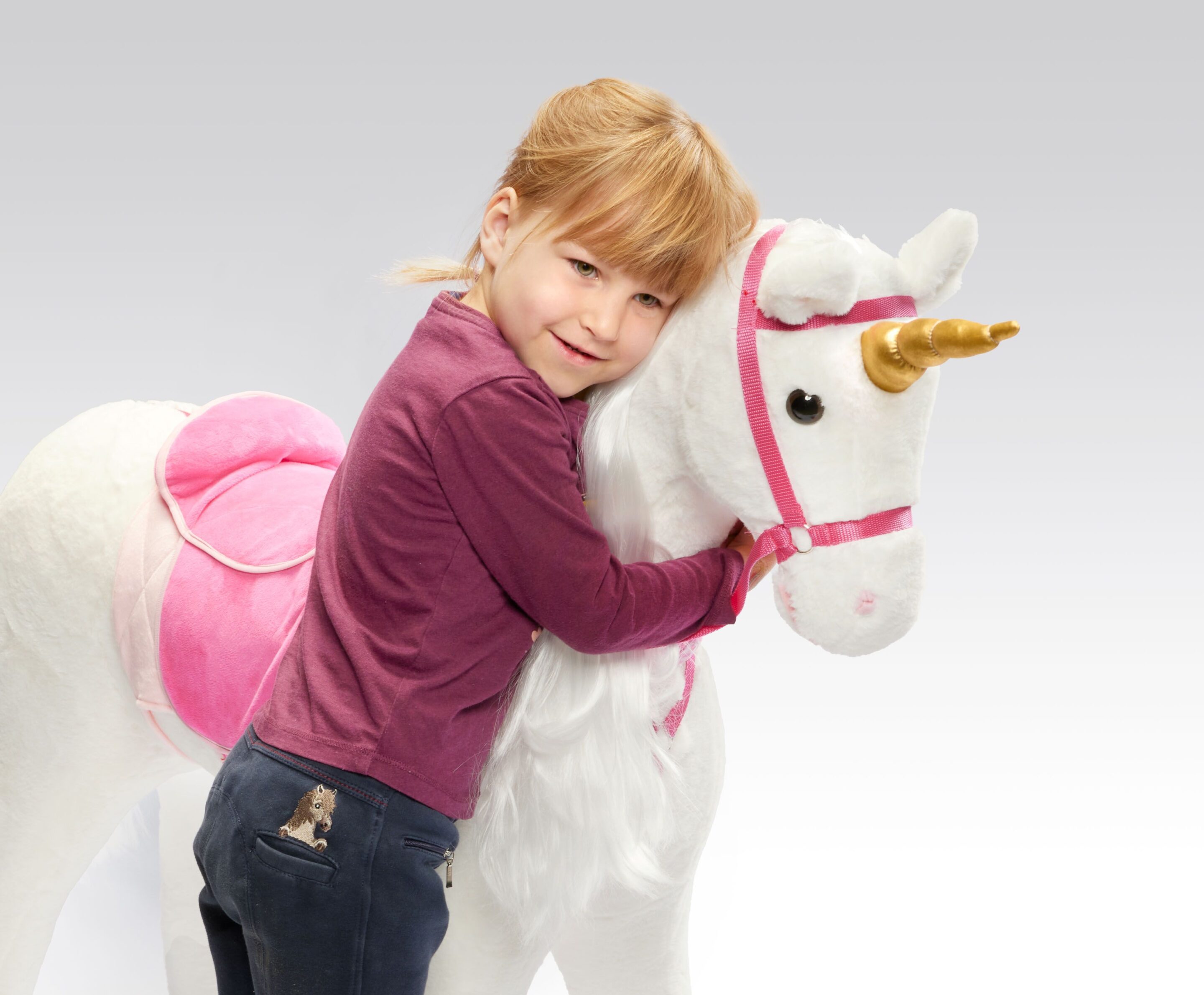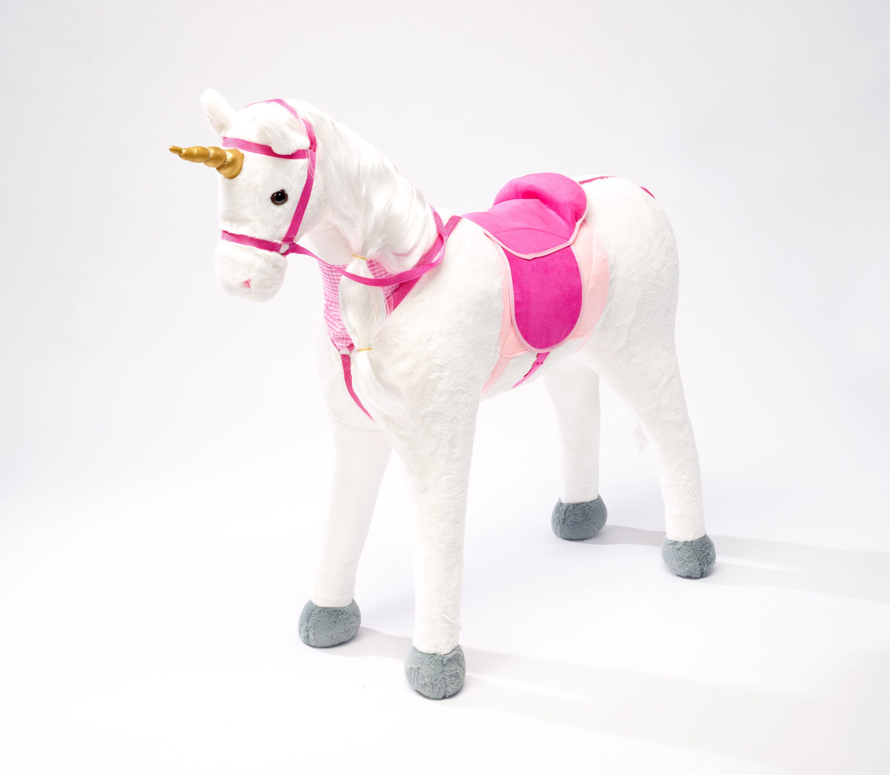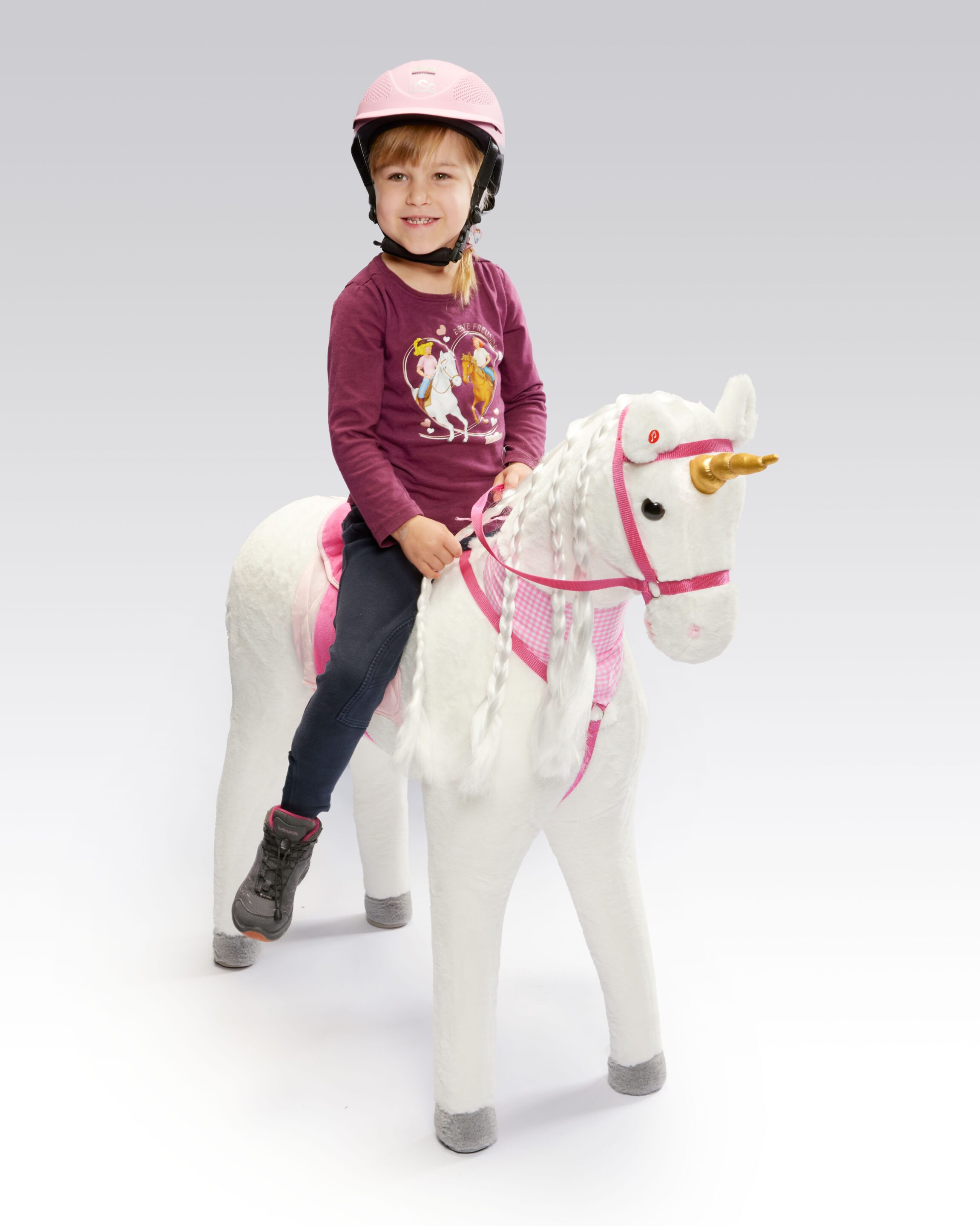 Ein Traum für kleine Pferdeliebhaber sind unsere fabrikneuen Spielpferde: da wird das Kinderzimmer zum Pferdestall. Ein großes, braves, stabiles, standfestes Einhorn- Stehpferd zum aufsitzen. ( Belastbar bis 100 kg) Die lange Mähne eignet sich hervorragend zum bürsten und Zöpfe flechten. Der Sattel lässt sich – nach dem Entfernen von Befestigungsfäden abnehmen und mittels Klettverschluss wieder befestigen.Zudem gehören zum Lieferumfang Zaumzeug, Sattel und Halstuch. Das Pony kann so wie ein echtes Pferd zum Ausritt bereit gemacht werden. Auf Knopfdruck am Ohr erklingt ein Galoppiergeräusch und das Pferd wiehert. Batterien sind bereits eingelegt.